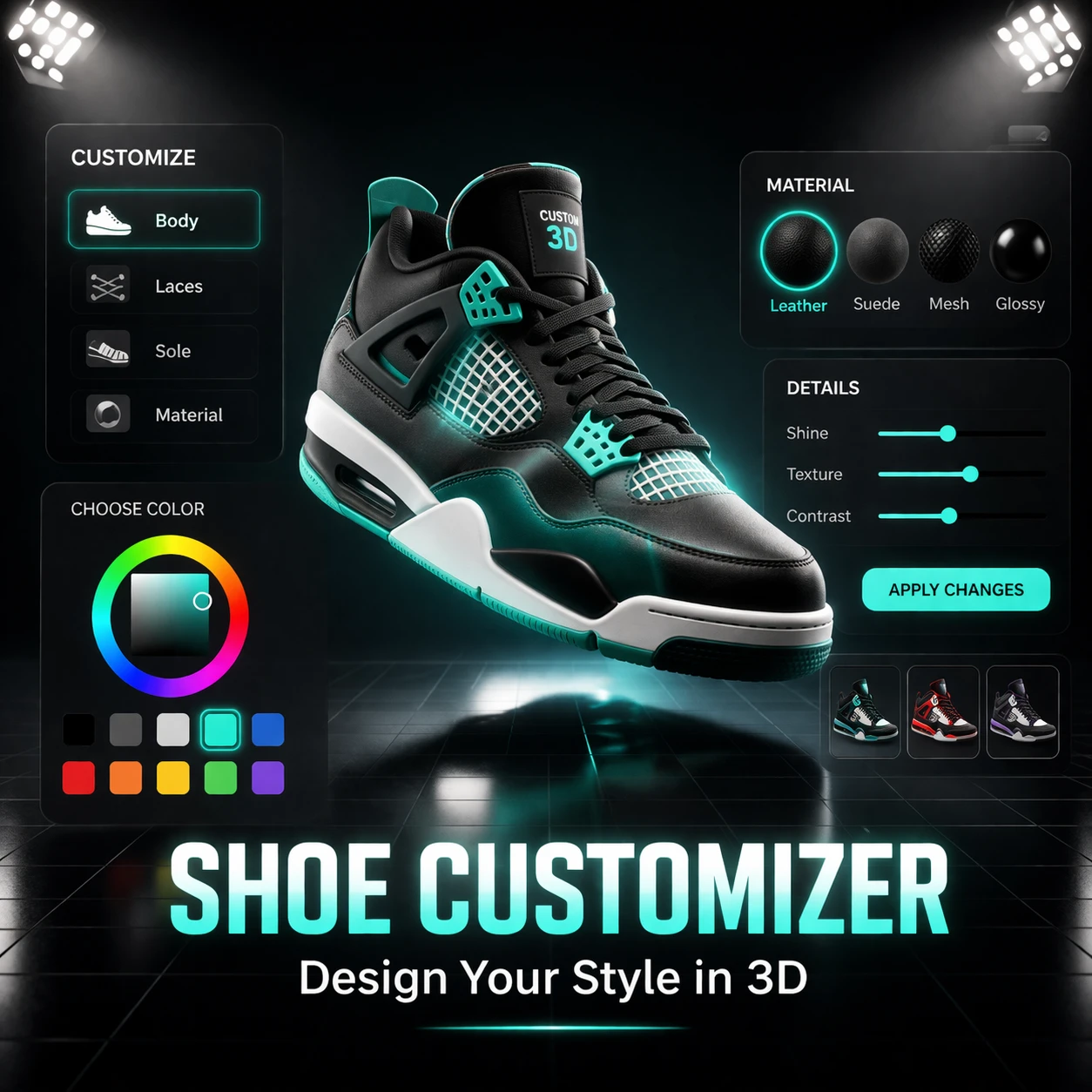The 3D Shoe Customizer is an interactive web application developed using React.js and Three.js that allows users to customize a 3D shoe model in real time. Users can modify different parts of the shoe such as the main body, stripes, and sole by changing colors dynamically.