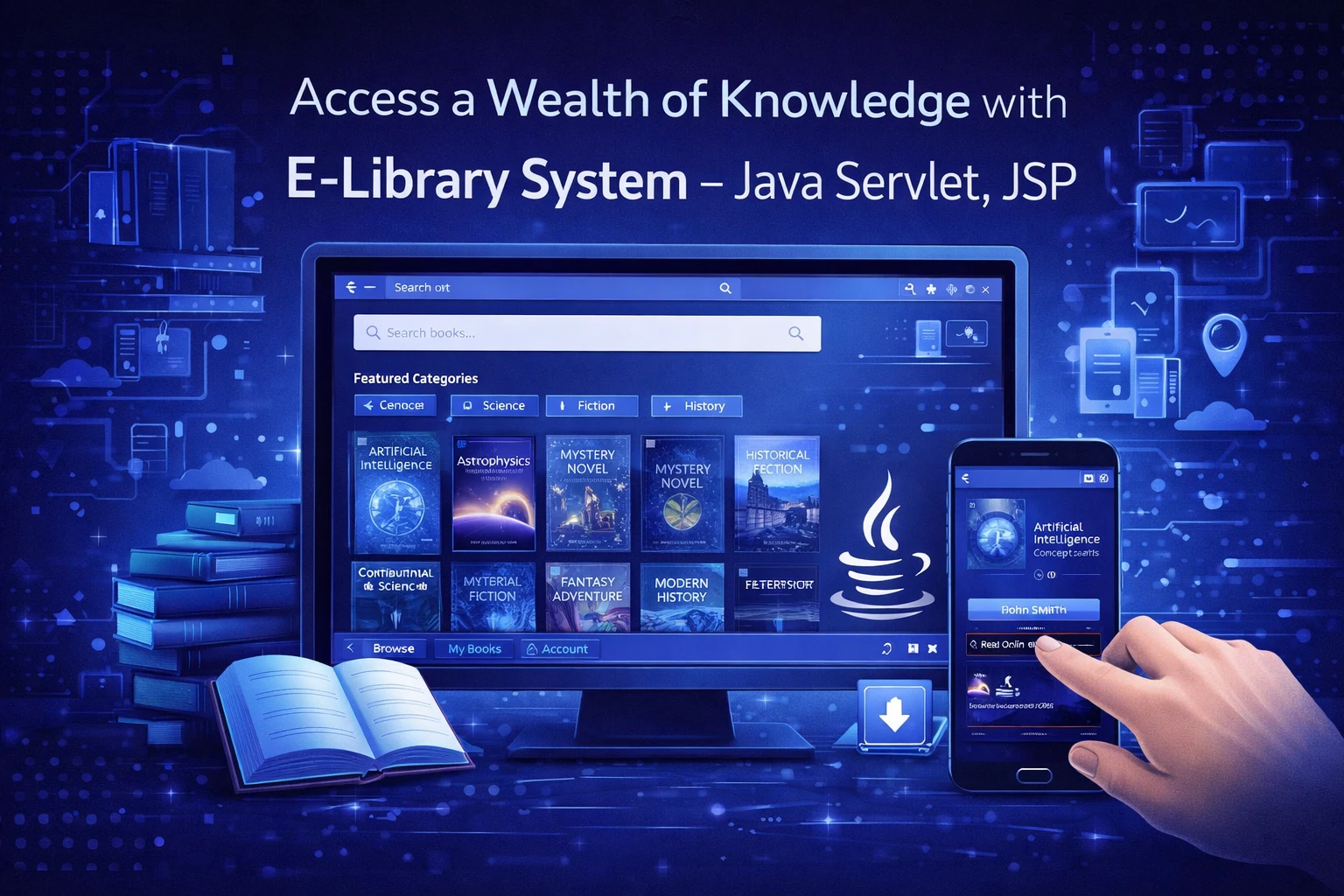 The E-Library System is a web-based application developed using Java Servlet and JSP to manage library operations digitally. Traditional library systems often rely on manual record keeping, which makes searching, issuing, and returning books slow and error-prone. This project provides an online platform where users can search books, view availability, issue or reserve books, and manage their library accounts.