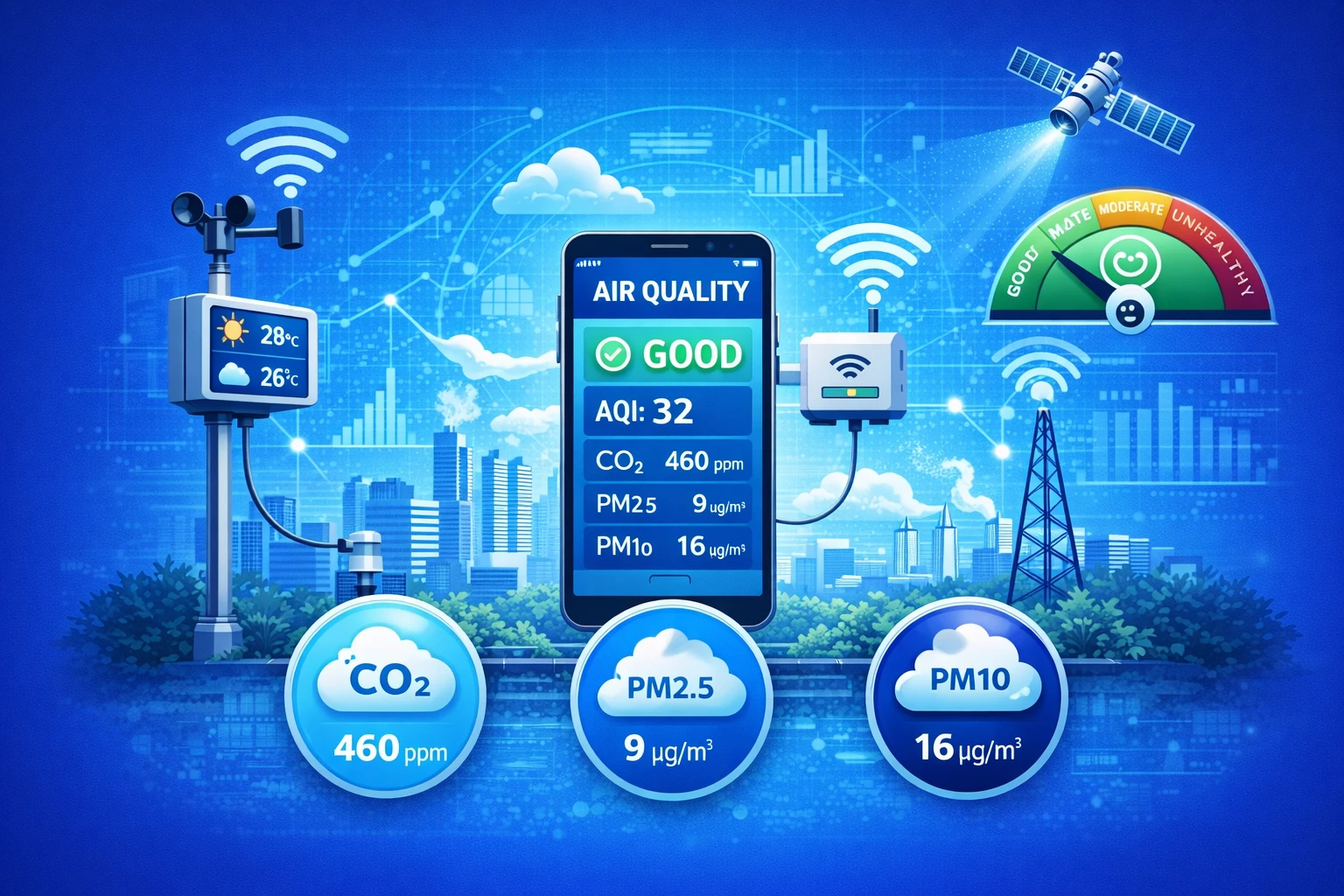 Air Quality Monitoring System is an IoT-based solution designed to measure and analyze environmental air pollutants in real time. The system uses gas sensors to detect harmful gases such as CO₂, CO, LPG, smoke, and particulate matter, and displays the data on a web or mobile application. It helps in identifying pollution levels, ensuring public safety, and supporting environmental monitoring initiatives.