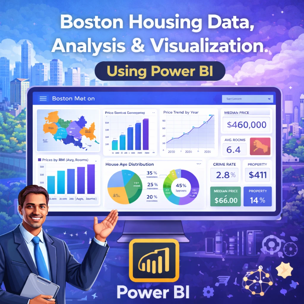 This project focuses on analysing the Boston Housing Dataset using Power BI, a powerful business intelligence and data visualization tool. The dataset is imported from a CSV file and contains various attributes that influence housing prices and residential decisions, such as crime rate, property age, proximity to employment centres, property tax rates, and number of rooms.