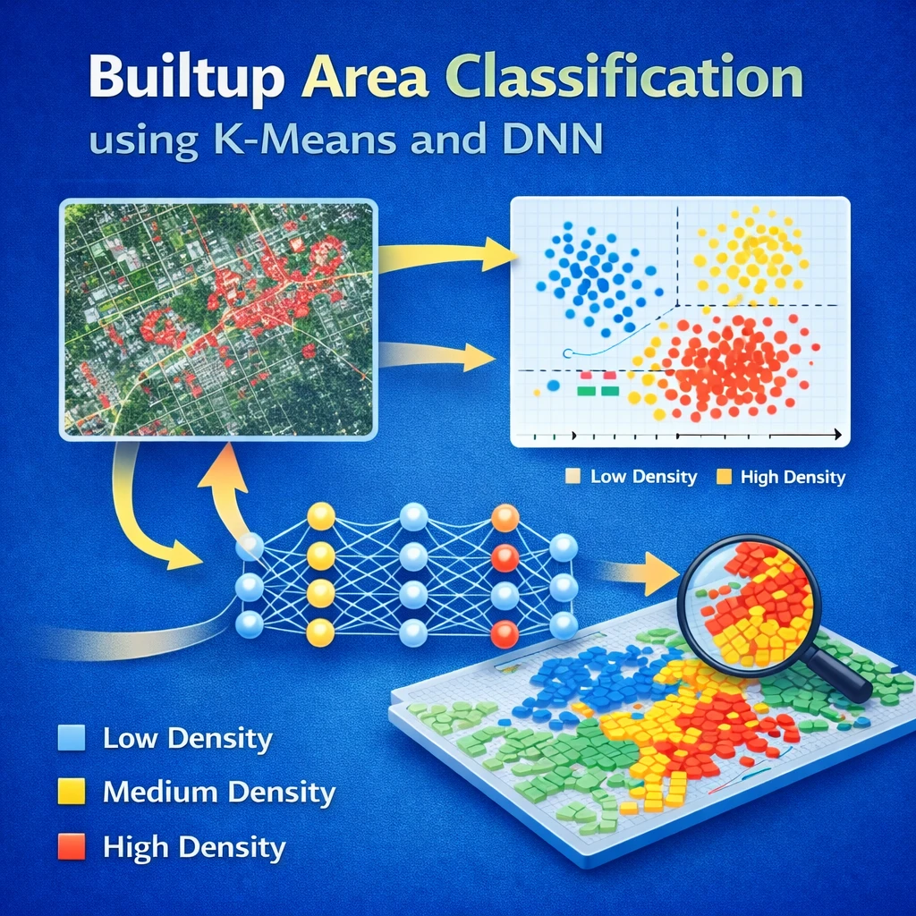 This project classifies built-up areas from satellite images using K-Means clustering and a Deep Neural Network (DNN). K-Means segments the image, and DNN accurately classifies built-up and non-built-up regions. The system improves accuracy and automation in urban area detection.