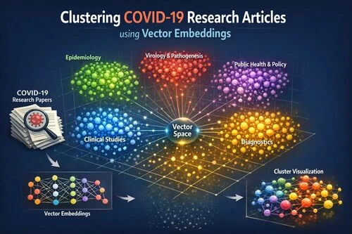 Clustering COVID-19 Research Articles using Vector Embeddings is an AI-driven approach that organizes large collections of COVID-19 research papers into meaningful groups based on their semantic similarity. By converting article text into numerical vector representations using embedding models, the system captures contextual meaning rather than just keywords. These vectors are then grouped using clustering algorithms to identify related research themes, trends, and emerging topics, helping researchers quickly explore and analyze vast amounts of scientific literature efficiently.
