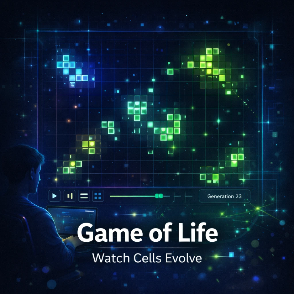 Conway’s Game of Life is a simulation-based project developed using React.js that demonstrates how complex patterns can emerge from simple rules. It is a zero-player game where cells evolve automatically based on predefined rules without any user intervention after initialization.