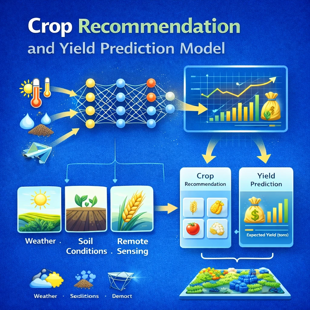 This project develops a Crop Recommendation and Yield Prediction Model using machine learning techniques. It analyzes soil nutrients, weather conditions, and historical data to suggest suitable crops and predict expected yield. The system helps farmers improve productivity and decision-making.