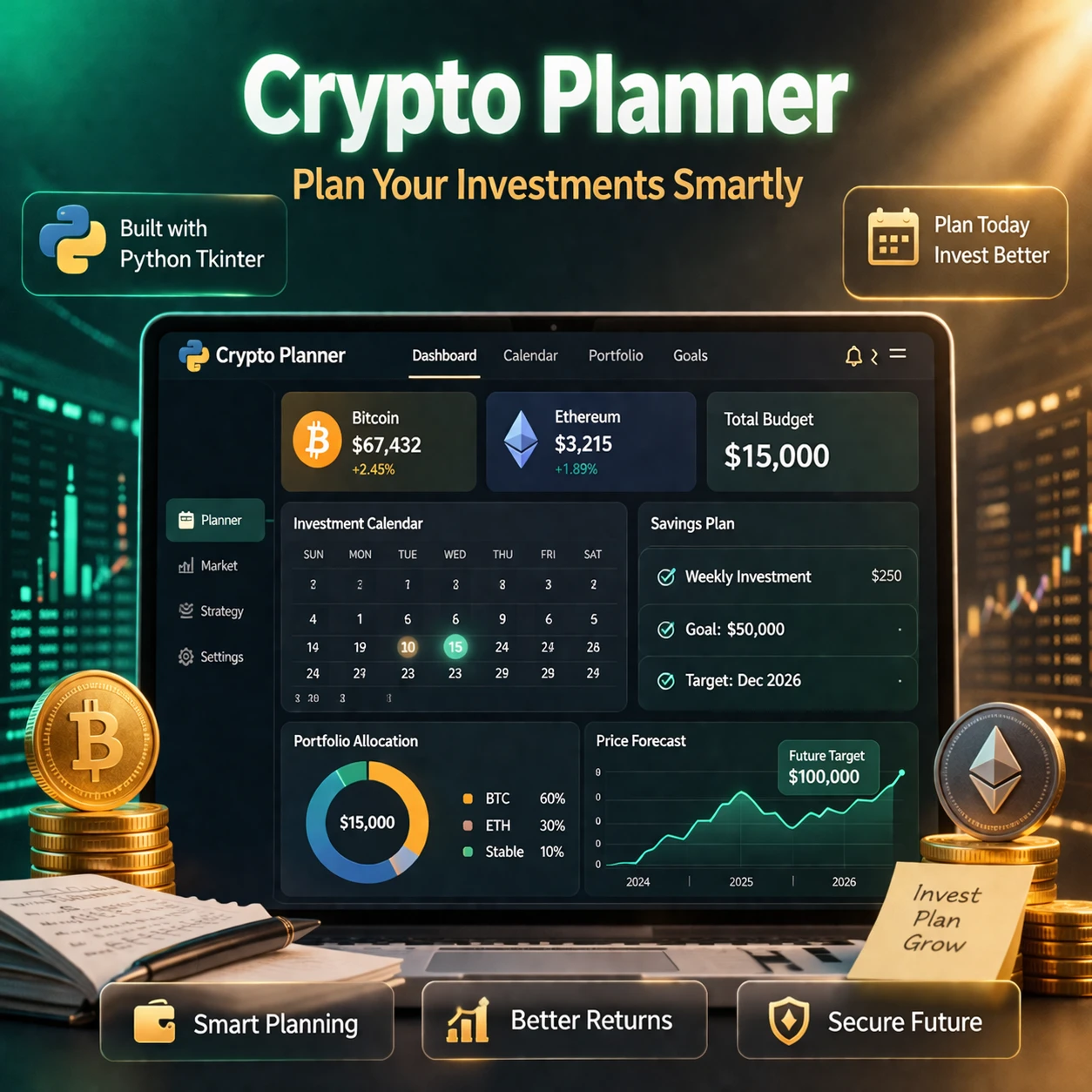 This project focuses on developing a Crypto Coin Planner using Python Tkinter, which helps users track cryptocurrency investments and analyze potential profits or losses automatically. The application fetches real-time cryptocurrency data from online sources using APIs and processes it using Python libraries.