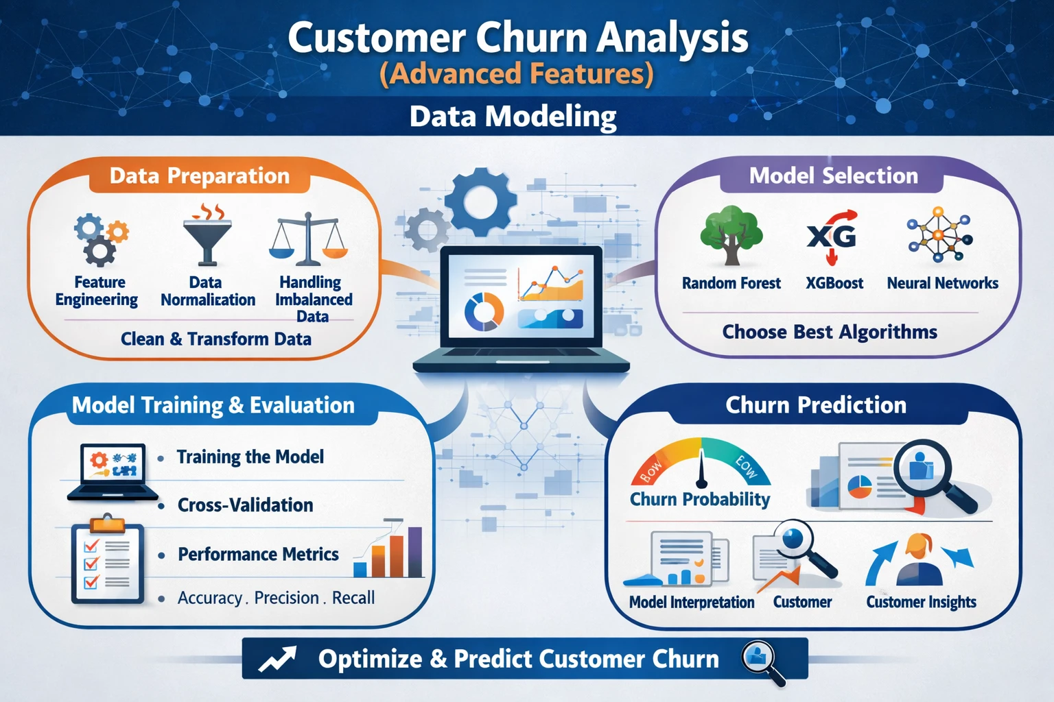 Customer churn analysis helps businesses identify customers who are likely to stop using their products or services. This project uses advanced data modeling techniques to analyze customer behavior, transaction history, engagement metrics, and demographic data to predict churn probability. By applying machine learning algorithms and feature engineering, the system enables organizations to improve customer retention strategies and reduce revenue loss.