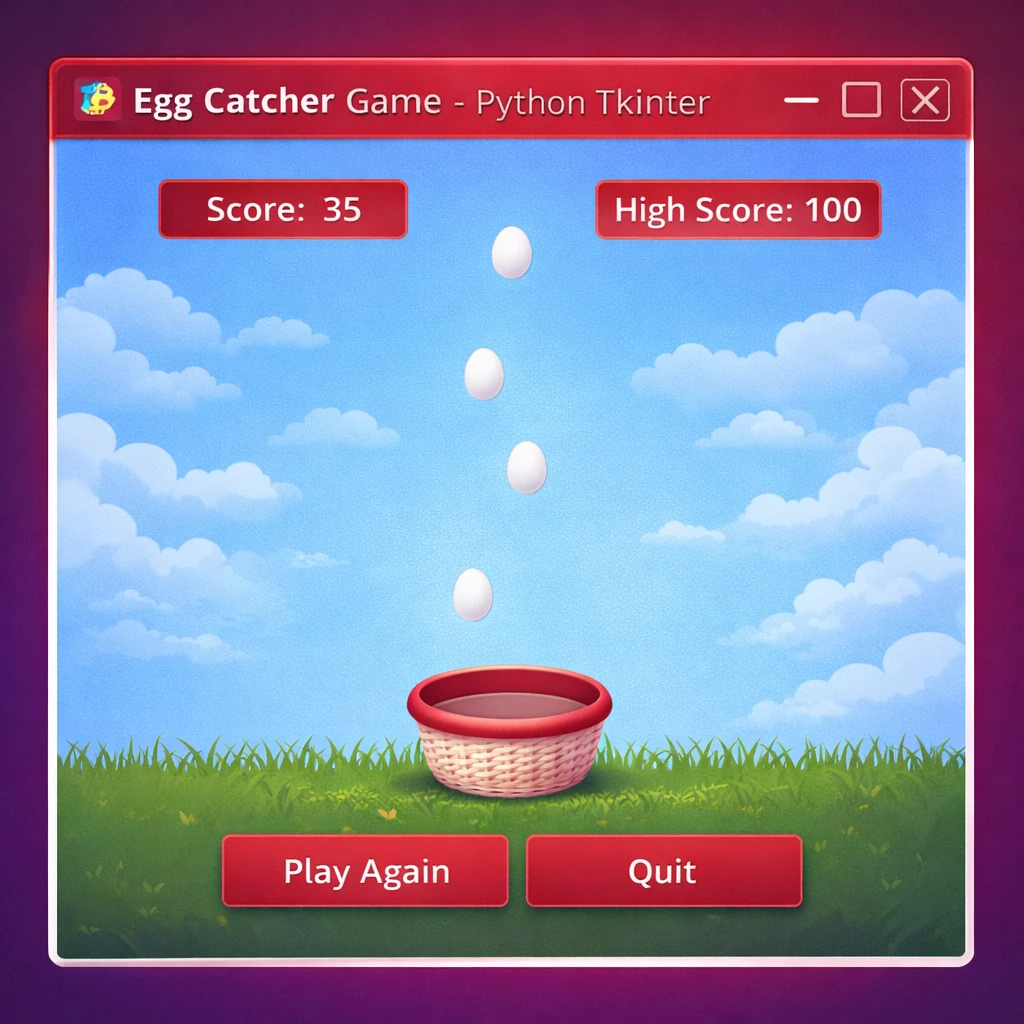 This project focuses on developing an Egg Catcher Game using Python and the Tkinter library. The game is designed with a graphical interface where eggs fall from the top of the screen and the player controls a basket to catch them.