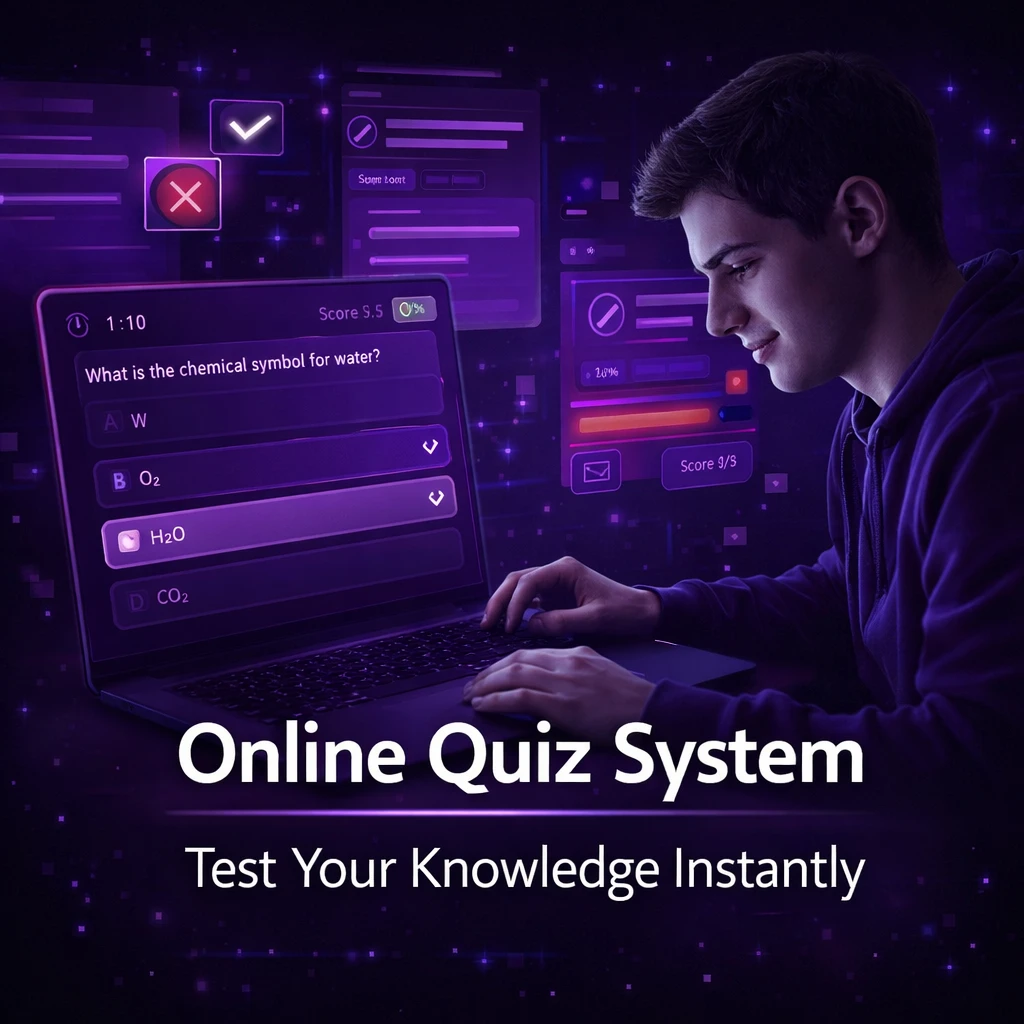 The Online Quiz System is a web-based application developed using JDBC (Java Database Connectivity) and JSP (Java Server Pages) to conduct quizzes in an efficient and automated manner. In traditional systems, quizzes are conducted manually using paper-based methods, which require significant time for evaluation and result processing. This project aims to provide a digital platform where quizzes can be conducted online with instant evaluation and result generation.