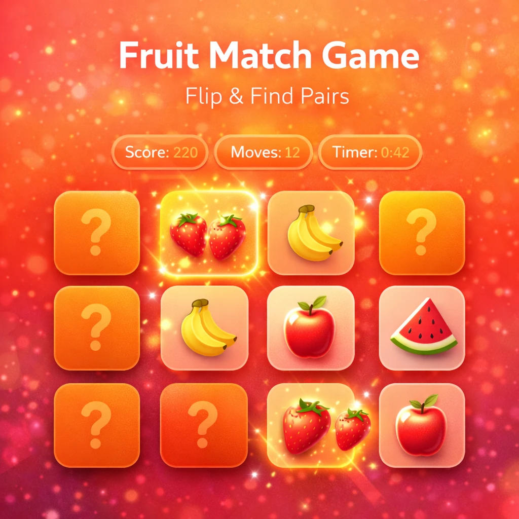Interactive games are an effective way to improve logical thinking, memory, and user engagement. The Fruit Card Matching Game is a fun and educational web-based application that challenges users to match pairs of identical fruit cards within a limited time.