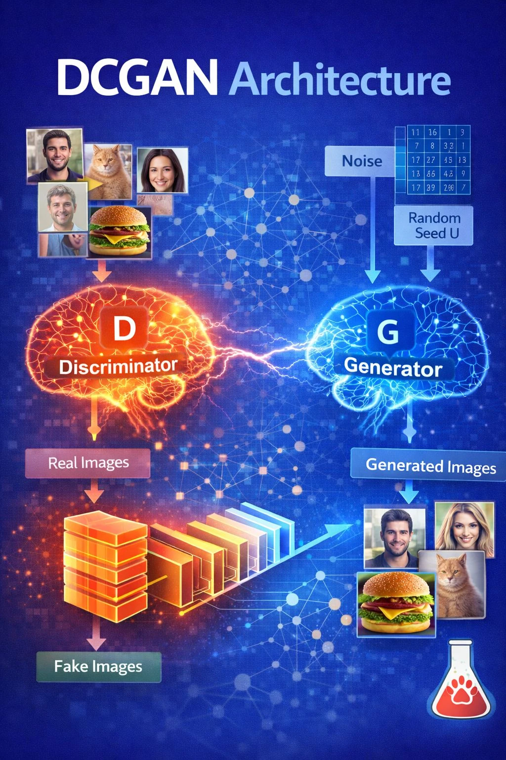 This project uses Deep Convolutional Generative Adversarial Networks (DCGAN) to generate realistic images from random noise. The model consists of a generator that creates images and a discriminator that evaluates them, improving image quality through adversarial training. DCGANs are widely used in image synthesis, data augmentation, and creative AI applications.