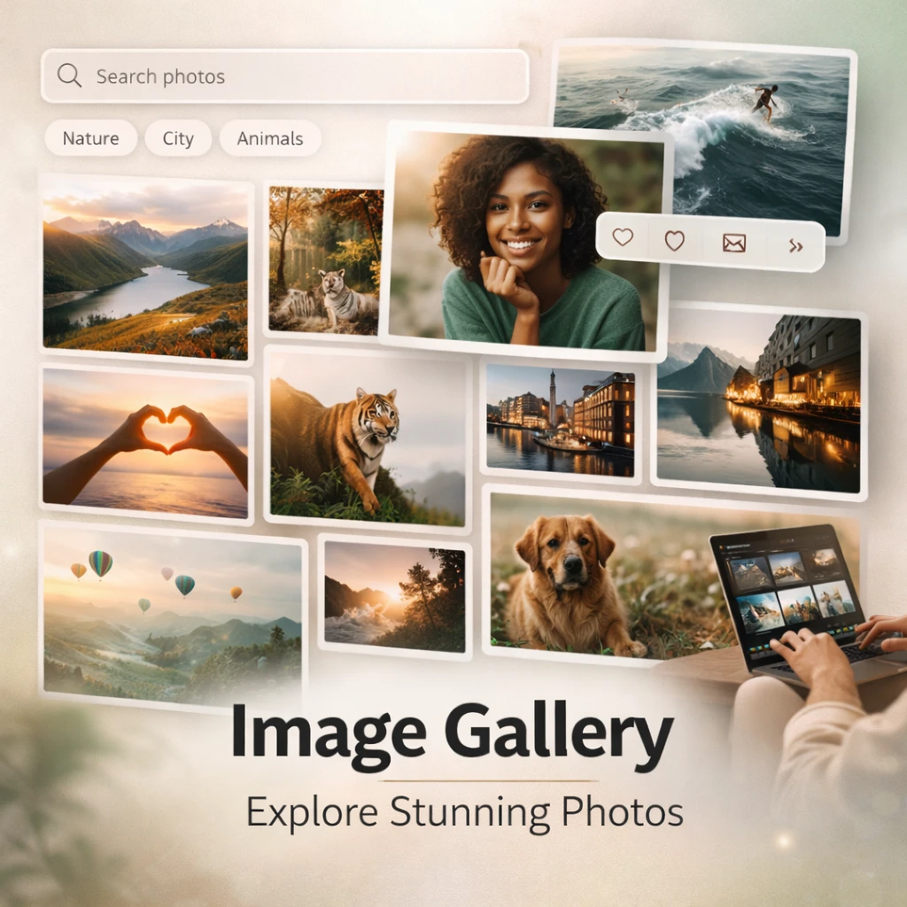 The Image Gallery Web Application is a React-based web app that allows users to browse, search, and save high-quality images using the Pexels API. The application provides a clean and interactive interface where users can explore images based on categories or search queries.