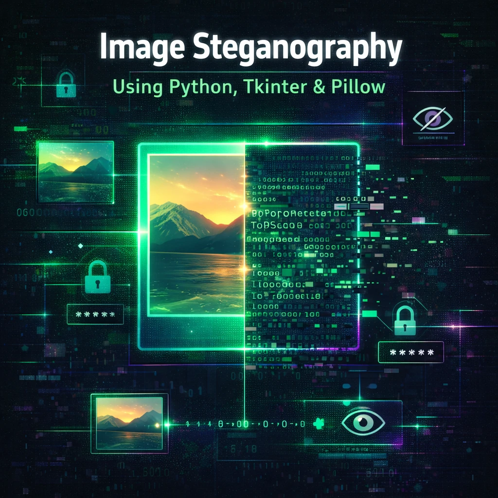 This project focuses on developing an Image Steganography application using Python programming language. The application allows users to hide text data inside an image and retrieve the hidden data whenever required. The system uses Tkinter for graphical user interface (GUI) and Pillow library for image processing.
