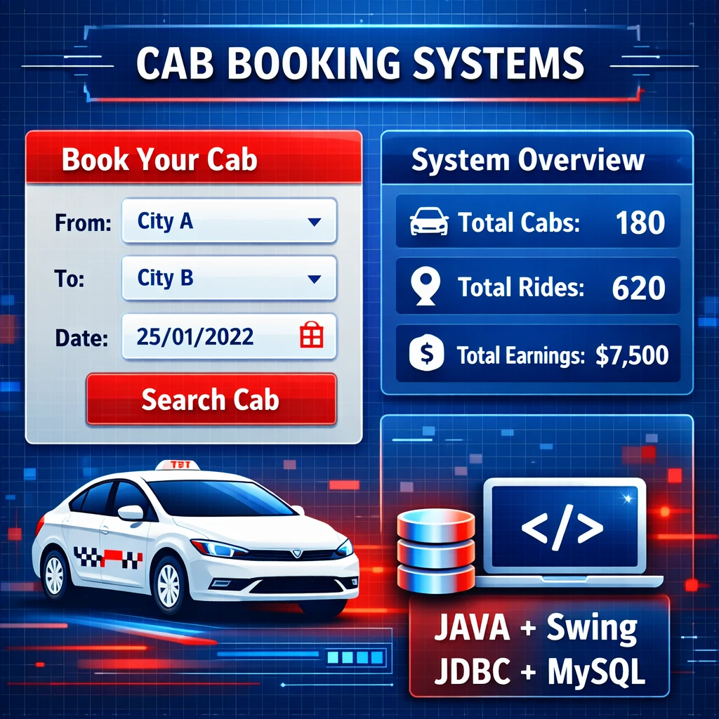 The Cab Booking System is a desktop-based application designed to automate and simplify the process of booking cabs for transportation services. The system is developed using Java as the programming language, Swing for designing the graphical user interface, JDBC (Java Database Connectivity) for connecting the application to the database, and MySQL for storing and managing cab booking information.