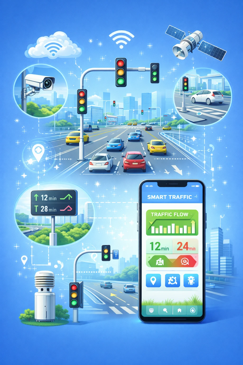 Smart Traffic Management System is an IoT and AI-based solution designed to monitor, control, and optimize traffic flow in urban areas. The system uses sensors, cameras, and real-time data analytics to reduce congestion, minimize travel time, and improve road safety. It automatically adjusts traffic signals based on vehicle density and provides live traffic updates to authorities and commuters.