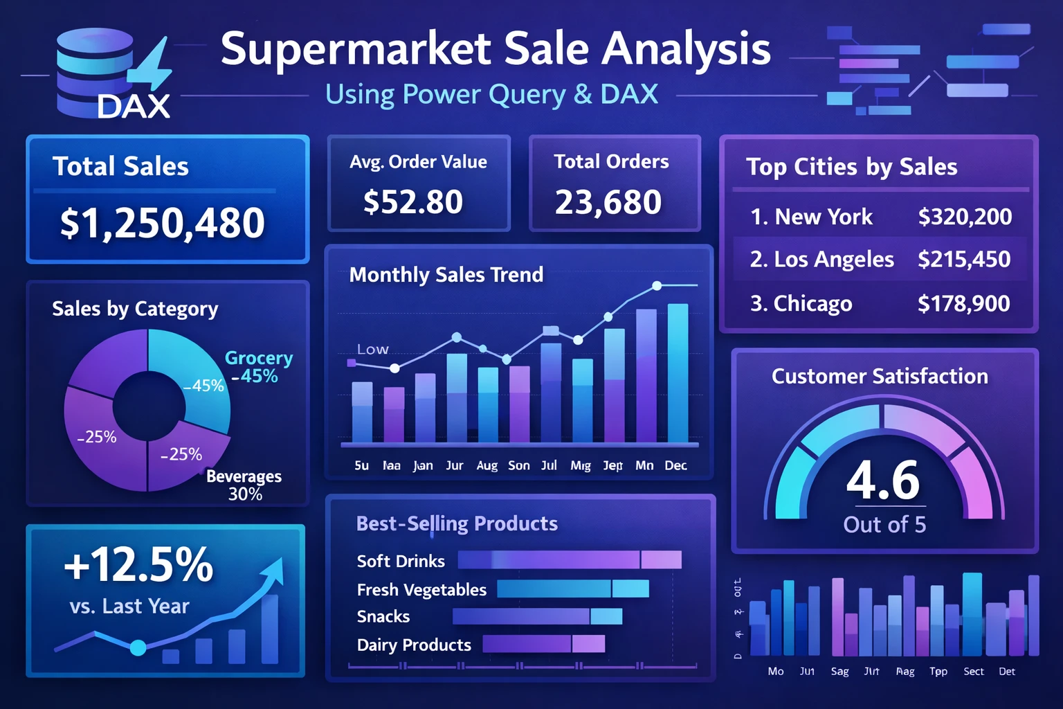 This project focuses on analyzing supermarket sales data using Microsoft Power BI with the help of Power Query and DAX (Data Analysis Expressions). Power Query is used for data cleaning, transformation, and preparation, while DAX is used for creating calculated measures and advanced analytics.