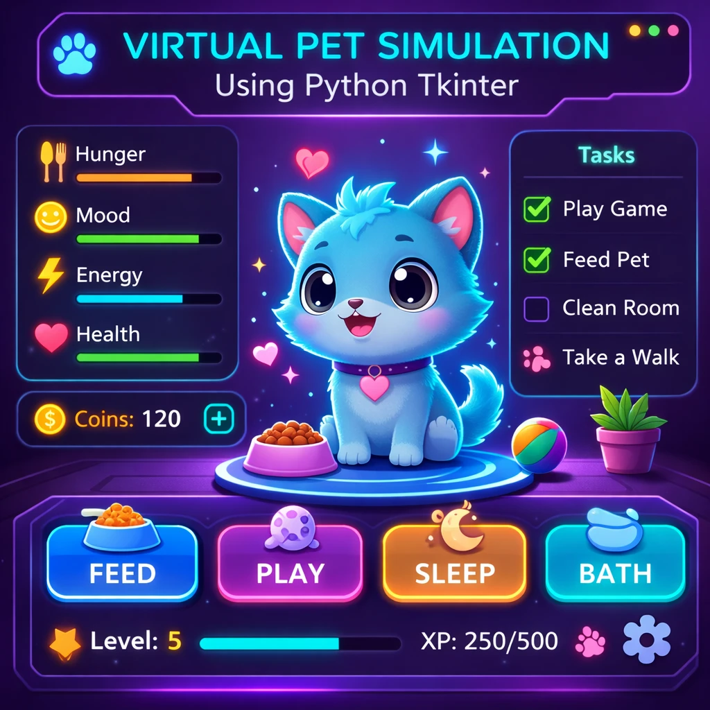 This project focuses on developing a Virtual Pet Simulation using Python and the Tkinter library. The application allows users to interact with a digital pet displayed on the screen. The pet reacts to different user actions such as moving the mouse cursor, clicking on the screen, or interacting with the application window.