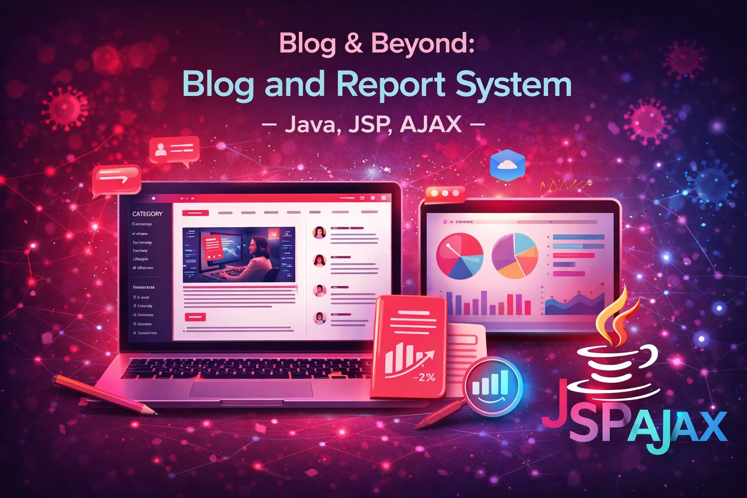 The Blog and Report System is a web-based application developed using Java, JSP, and AJAX to allow users to create, manage, and share blogs and reports online. In today’s digital world, blogging has become a popular way to express ideas, share knowledge, and communicate information. However, traditional systems may lack dynamic interaction and efficient data management. This project aims to provide a modern platform where users can write, edit, publish, and view blogs in an interactive and user-friendly environment.