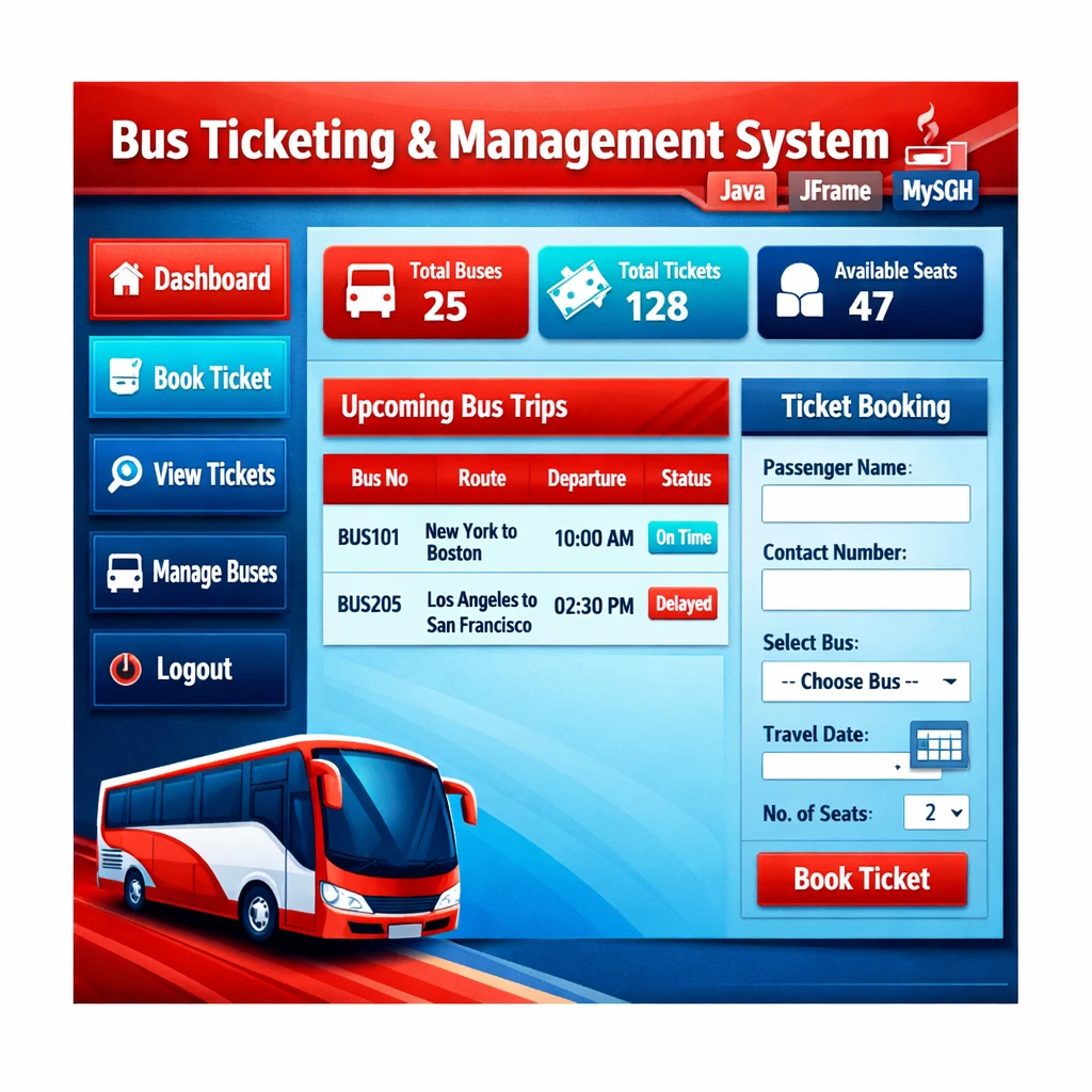 The Bus Ticketing & Management System is a desktop-based application developed using Java, JFrame, and MySQL to simplify and automate the process of booking bus tickets and managing transportation records. The main objective of this system is to provide a digital platform where passengers can book tickets and administrators can efficiently manage bus schedules, routes, and passenger information.
