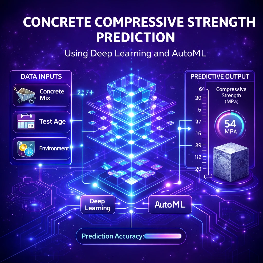 This project focuses on predicting the compressive strength of concrete using deep learning techniques and Automated Machine Learning (AutoML). The dataset used in this project contains various ingredients of concrete such as cement, blast furnace slag, fly ash, water, superplasticizer, coarse aggregate, fine aggregate, and age.