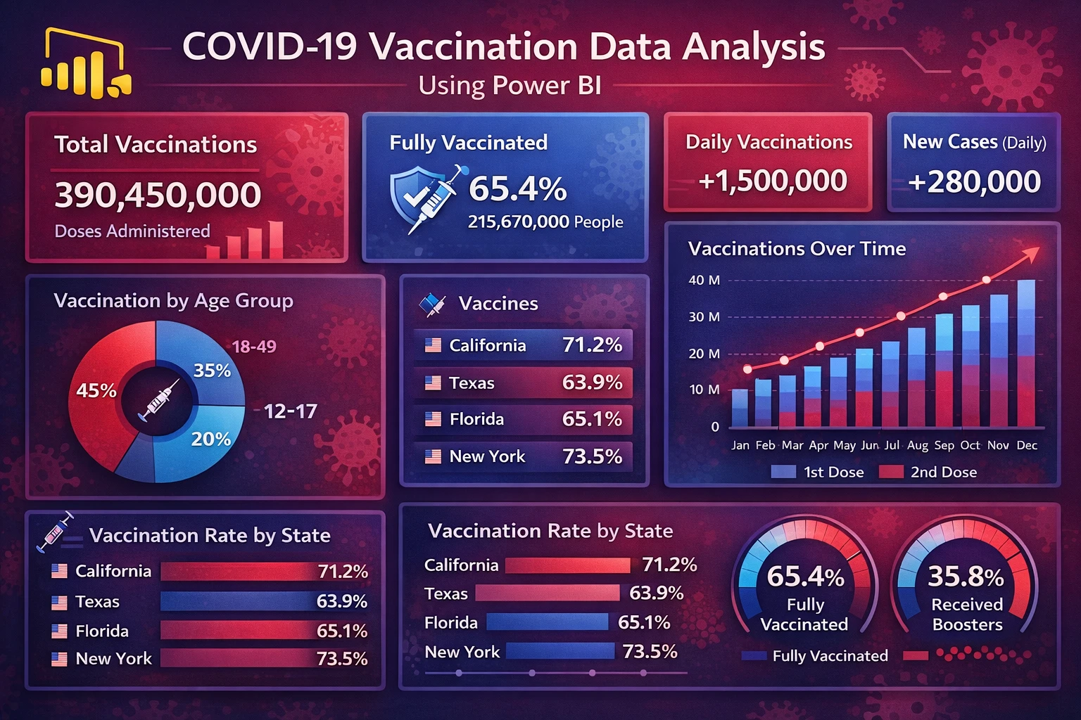 Using Power BI, the dataset is first imported and cleaned using the Power Query Editor. Data preprocessing includes identifying missing values, replacing null values with appropriate values, verifying data types, and removing unnecessary columns. After cleaning the dataset, interactive visualizations and dashboards are created to analyse vaccination trends across different countries and time periods.