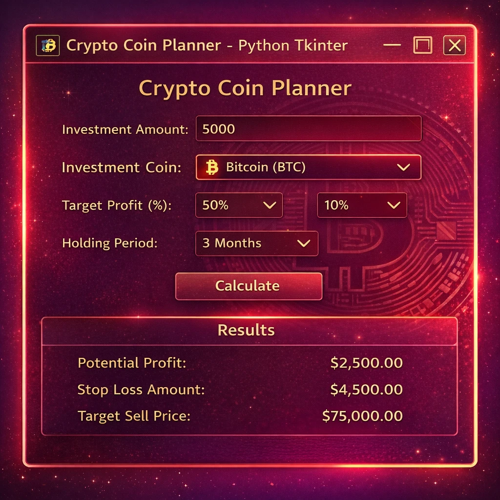 This project focuses on developing a Crypto Coin Planner using Python Tkinter, which helps users track cryptocurrency investments and analyze potential profits or losses automatically. The application fetches real-time cryptocurrency data from online sources using APIs and processes it using Python libraries.