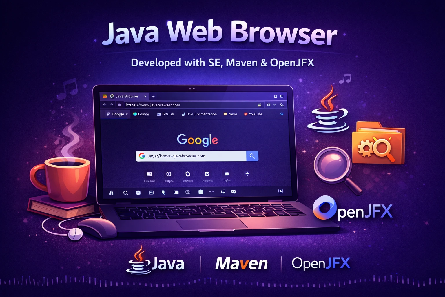 The application is built using Java SE for core programming, OpenJFX for creating a modern graphical user interface, and Maven for project build management and dependency handling. OpenJFX provides advanced UI components and a smooth user experience, while Maven simplifies project configuration, library management, and compilation. The browser may include features such as an address bar, back and forward navigation, refresh option, webpage display area, and basic browsing controls.