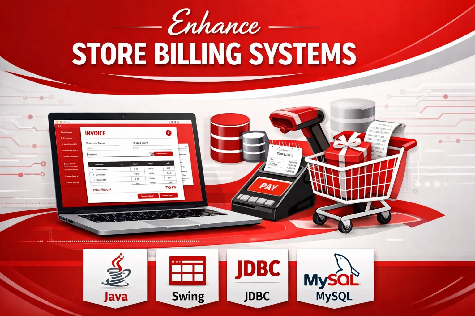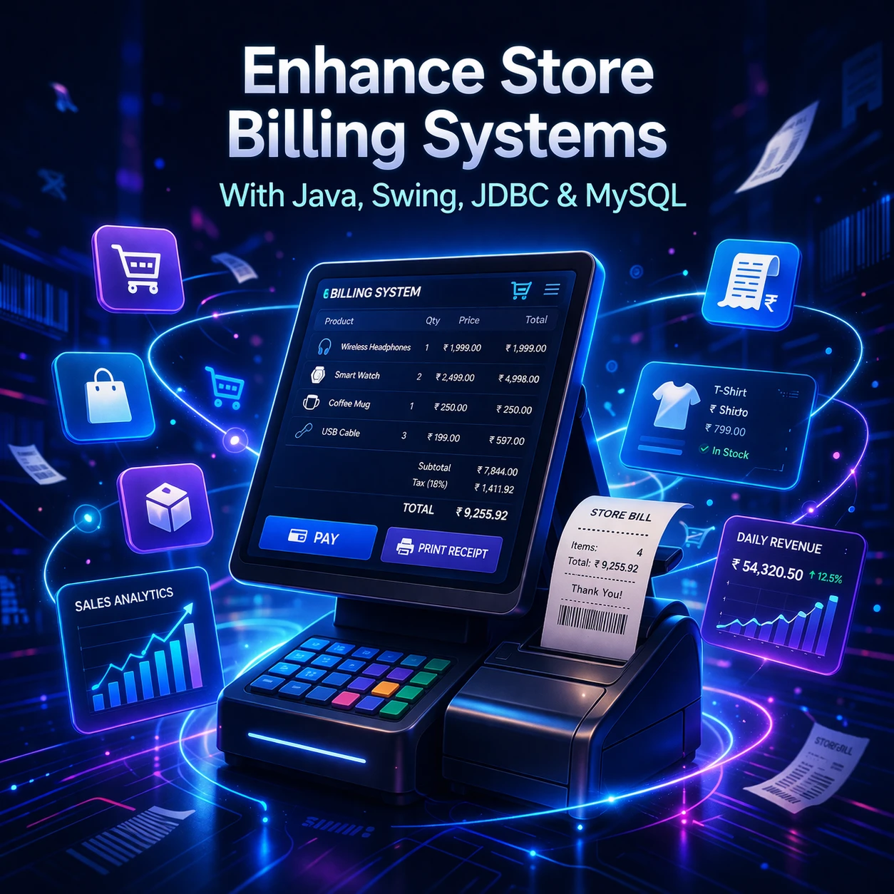 The Store Billing System is a desktop-based application developed to automate billing and sales operations in retail shops and stores. It is built using Java for core programming, Swing for designing the graphical user interface, JDBC for connecting the application to the database, and MySQL for storing product, customer, billing, and sales data.