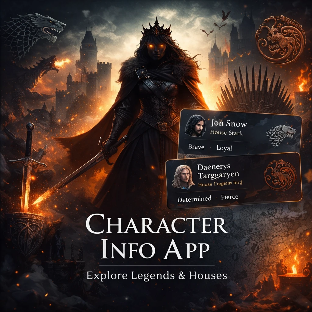 The Game of Thrones Character Info App is a multi-page React application that allows users to view detailed information about popular characters from the Game of Thrones series. The app displays each character's name, image, and popular dialogues. The application uses React Router Dom for navigating between different pages and two external APIs to fetch character data and quotes.