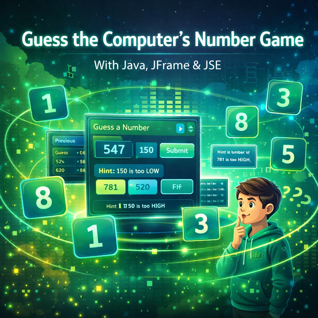 The game demonstrates how Java can be used to build interactive applications with graphical components while implementing basic game logic. In this system, the computer selects a random number, usually between 1 and 100, and the player tries to identify that number by entering guesses into the application. After each guess, the system provides feedback indicating whether the guessed number is too high, too low, or correct.