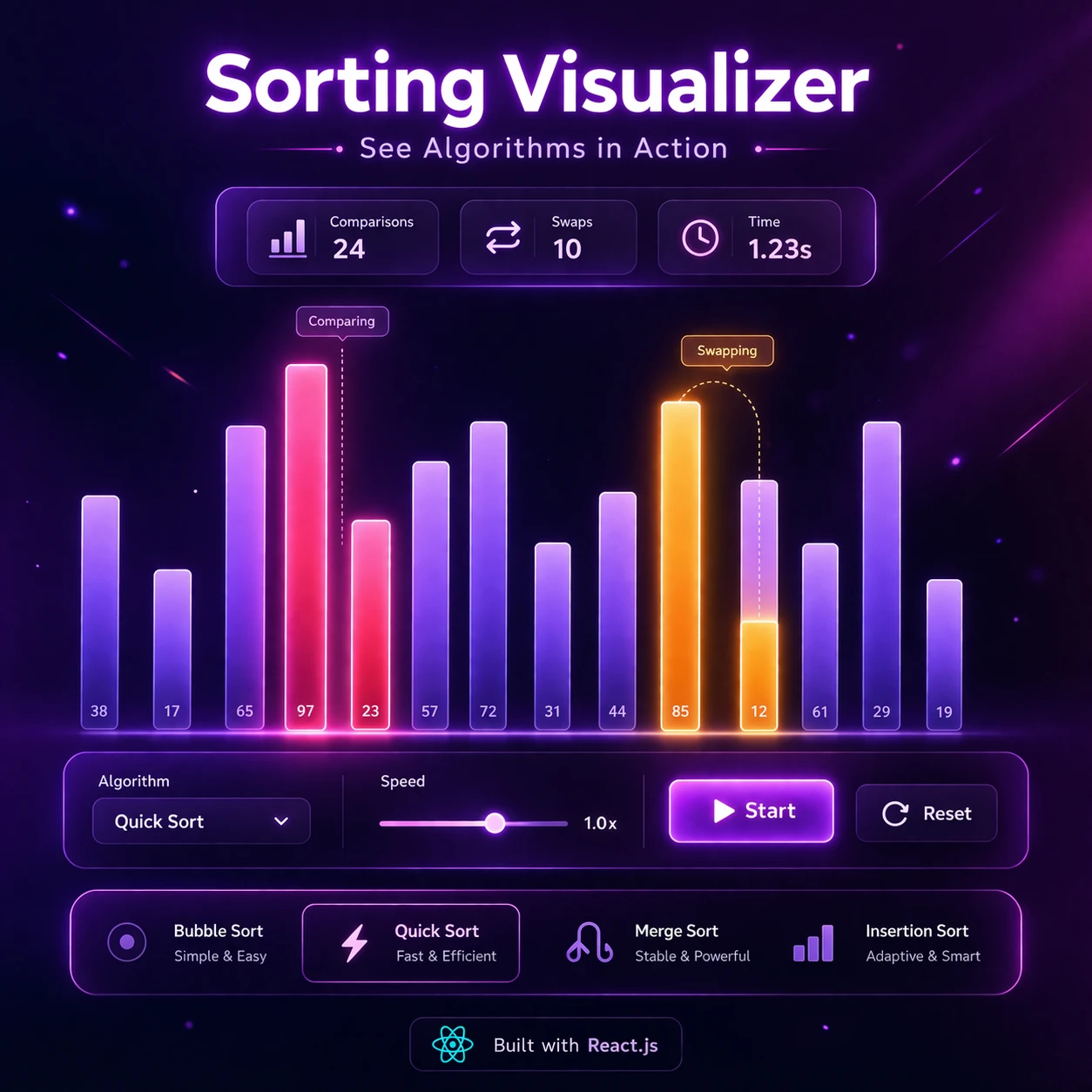 The system dynamically displays how elements are rearranged during the sorting process, helping users better understand algorithm behavior and performance. This project demonstrates how modern frontend frameworks like React.js can be used to build educational and interactive tools for algorithm visualization.